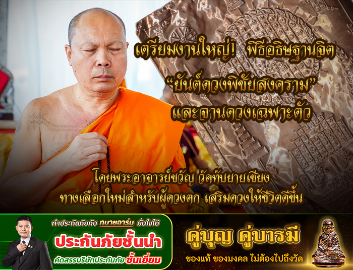 หากท่านสนใจอยากมียันต์ดวงพิชัยสงครามที่จานดวงตามวัน-เดือน-ปีเกิดของตนเอง โดยผ่านการอธิษฐานจิตจากพระเกจิผู้ทรงวิชา ขอเรียนเชิญร่วมพิธี จานยันต์ดวงพิชัยสงคราม” โดยพระอาจารย์ขวัญ วัดทับยายเชียง ซึ่งกำลังจะจัดขึ้นในเร็ว ๆ นี้ โปรดติดตามรายละเอียดกำหนดการและช่องทางการเข้าร่วมได้ทาง เว็บไซต์ศูนย์วัตถุมงคล คู่บุญคู่บารมี