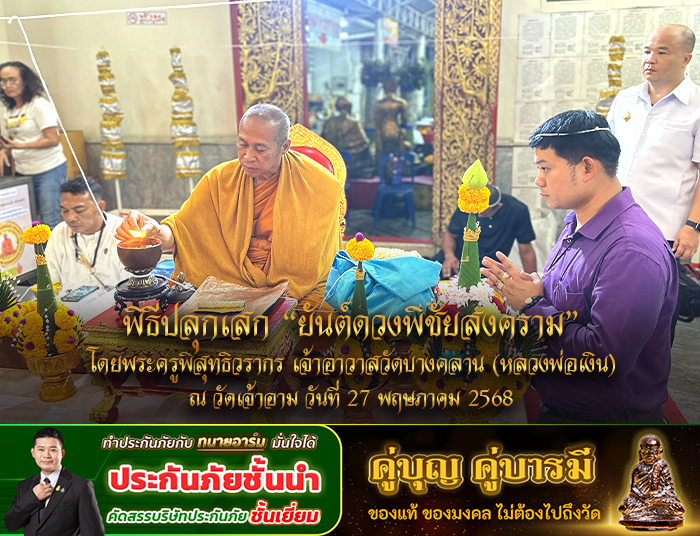 พิธีปลุกเสก “ยันต์ดวงพิชัยสงคราม” โดยพระครูพิสุทธิวรากร เจ้าอาวาสวัดบางคลาน (หลวงพ่อเงิน) ณ วัดเจ้าอาม วันที่ 27 พฤษภาคม 2568